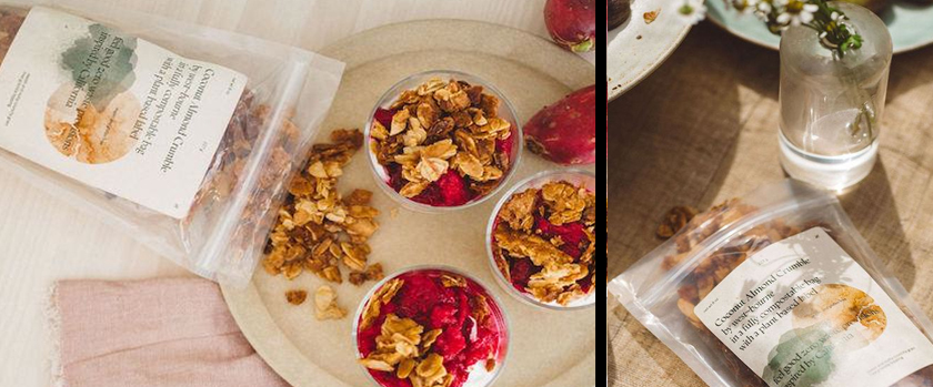 Dukkah de Pistachos, Crujiente de coco y almendras, Granola tostada o Mezclas para gofres; en bolsas de celulosa de madera y resinas de base biológica compostables.