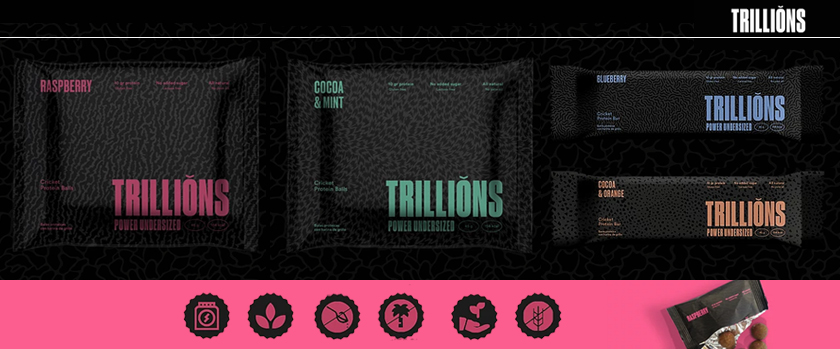 Trillions presenta barritas proteicas con harina de grillo; con sabor Frambuesa o sabor Menta y Chocolate; también Naranja y Chocolate o Arándanos.