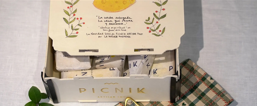Idea de ‘Picnik Artisan Food’, tienda del Soho malagueño, abierta en 2.019 por Aura Damián y Christian Mica, especialistas en quesos y en difusión de la cultura del queso artesano y eventos, con tienda online. Comercializan quesos originales, genuinos y de difícil acceso; Siete Lobas de León, La Hortelana de Málaga, El Abuelo Ruperto de Murcia, El Teyedu de Asturias o el Gamoneu, Monje Jimeno…